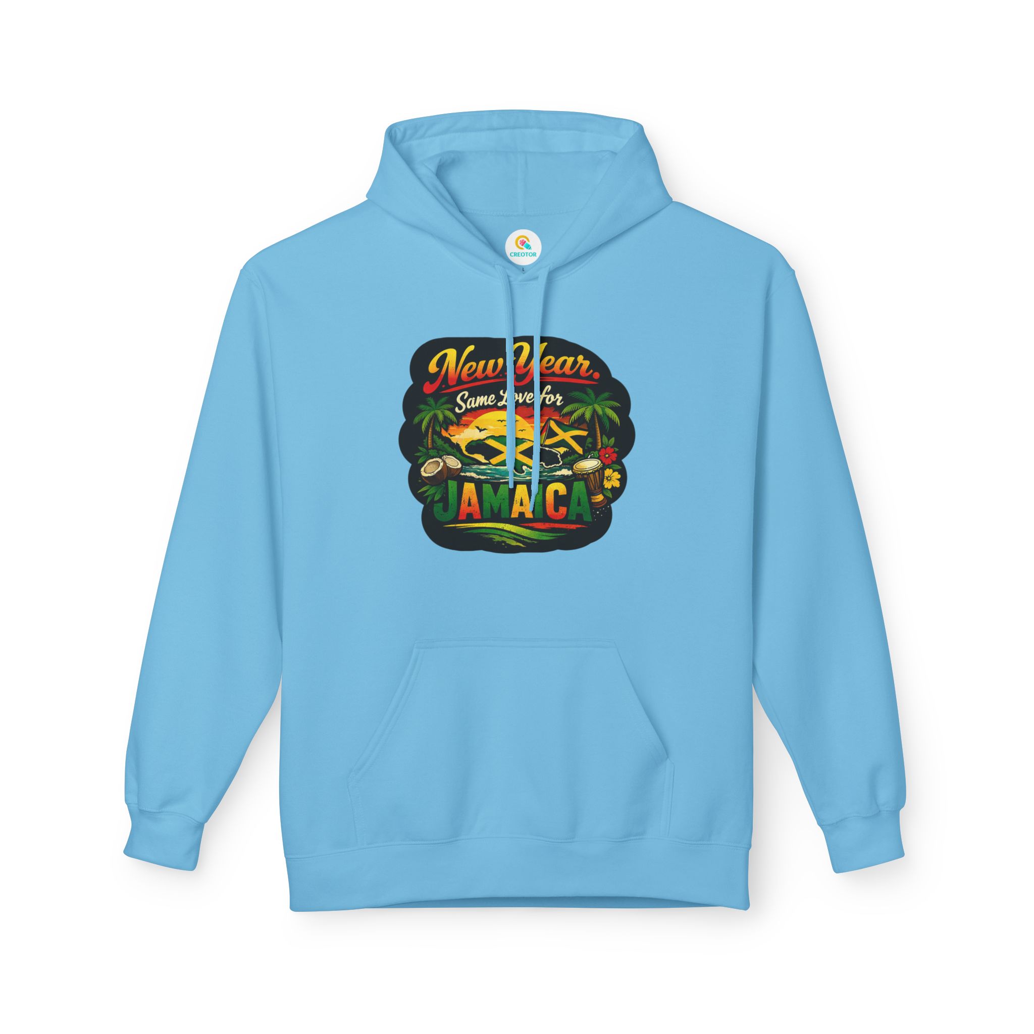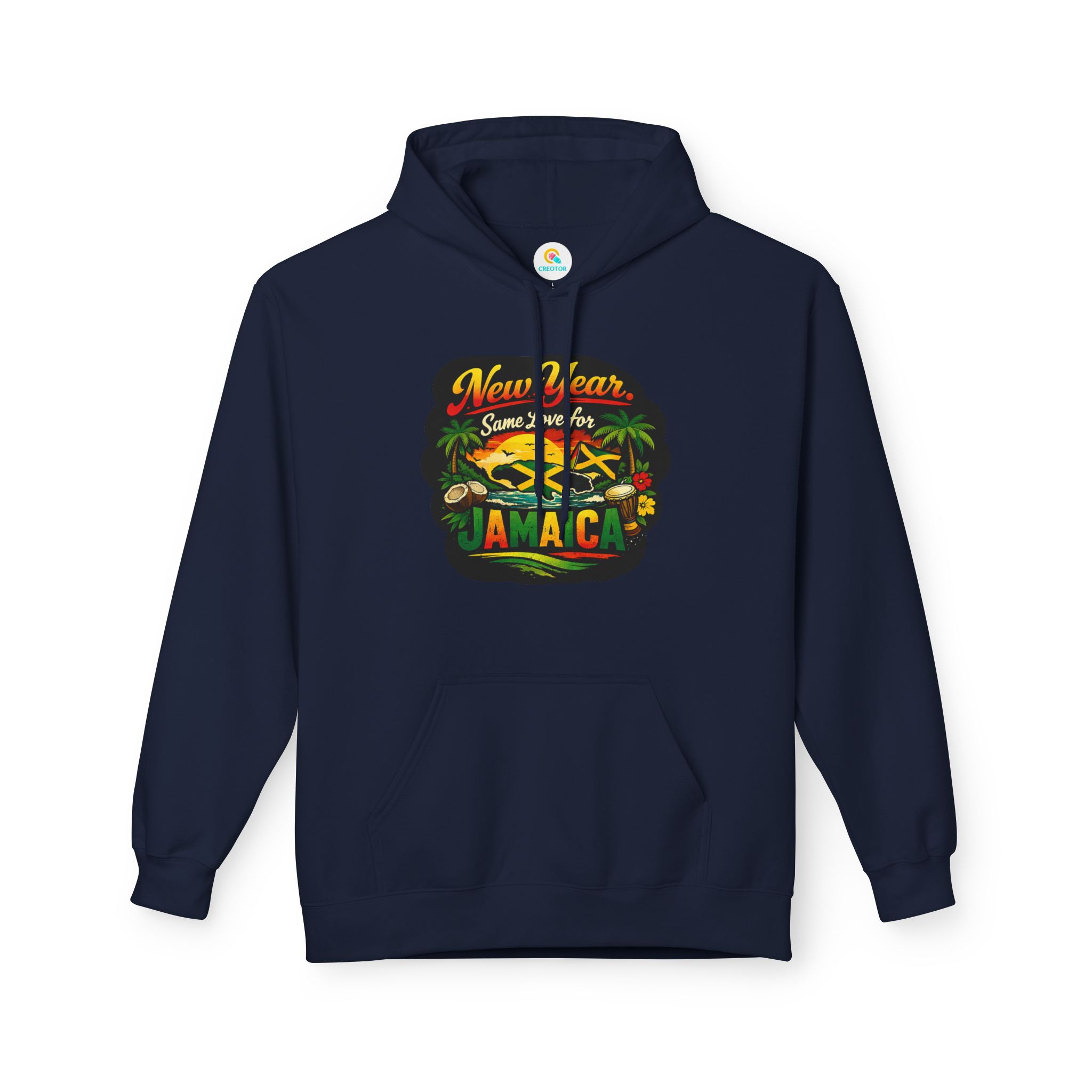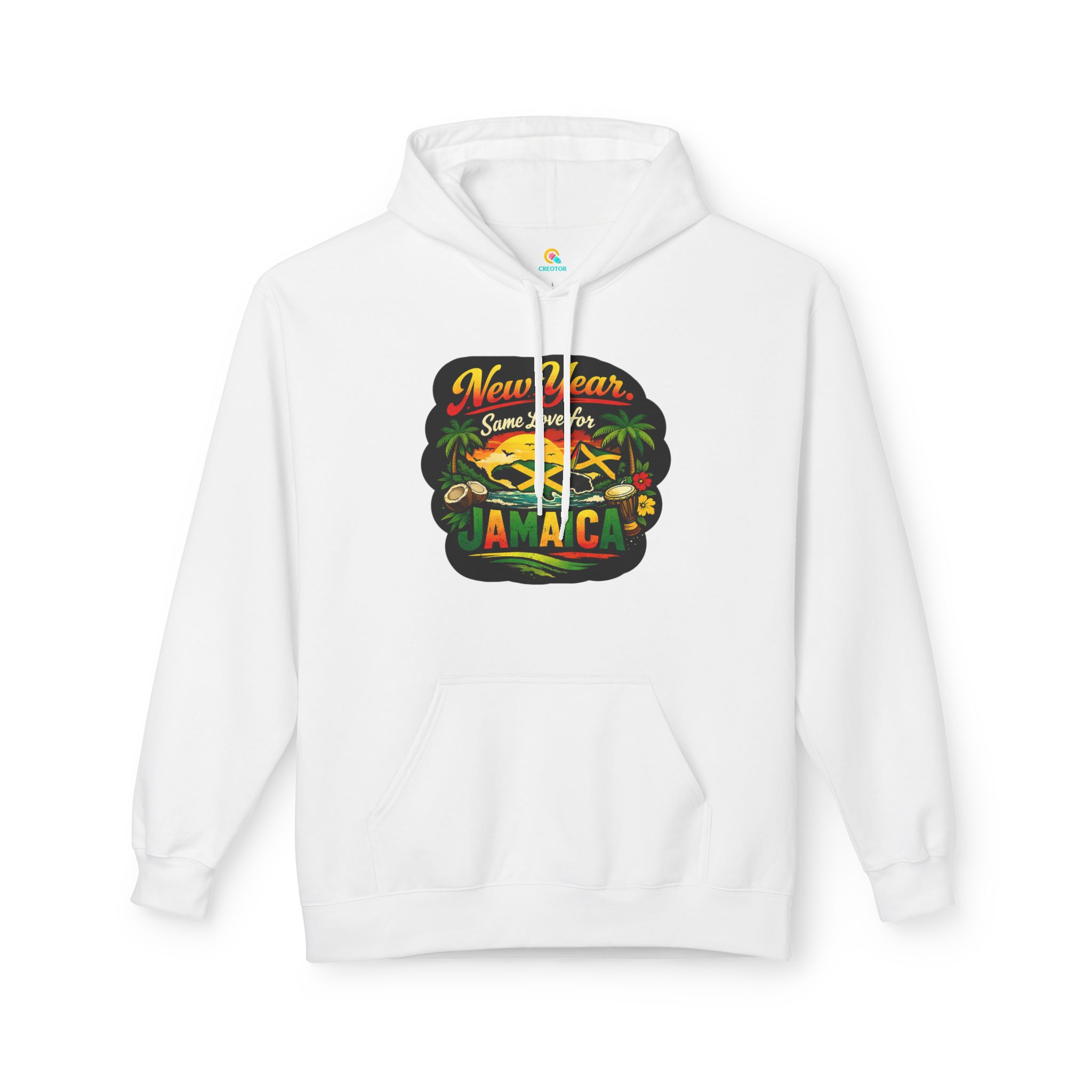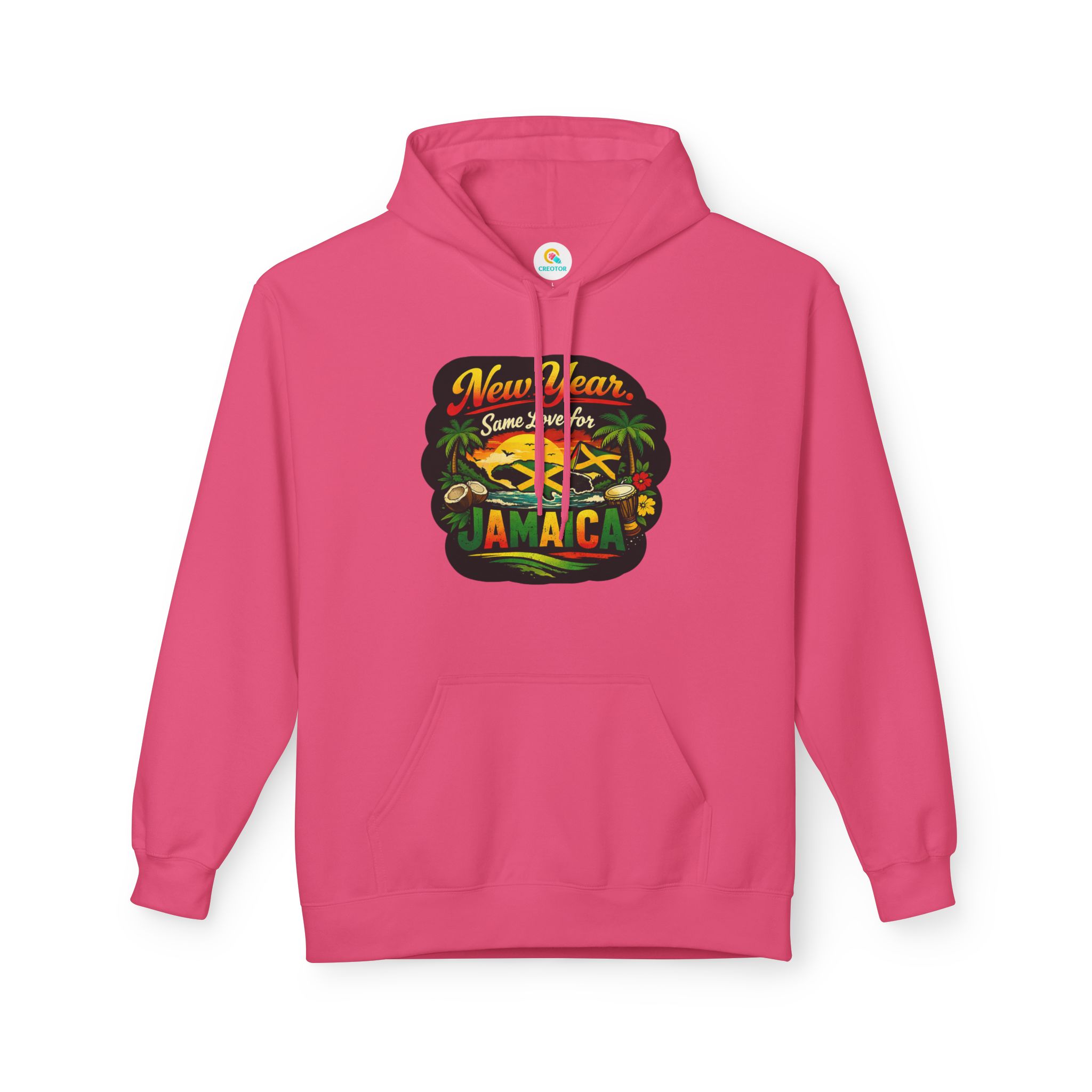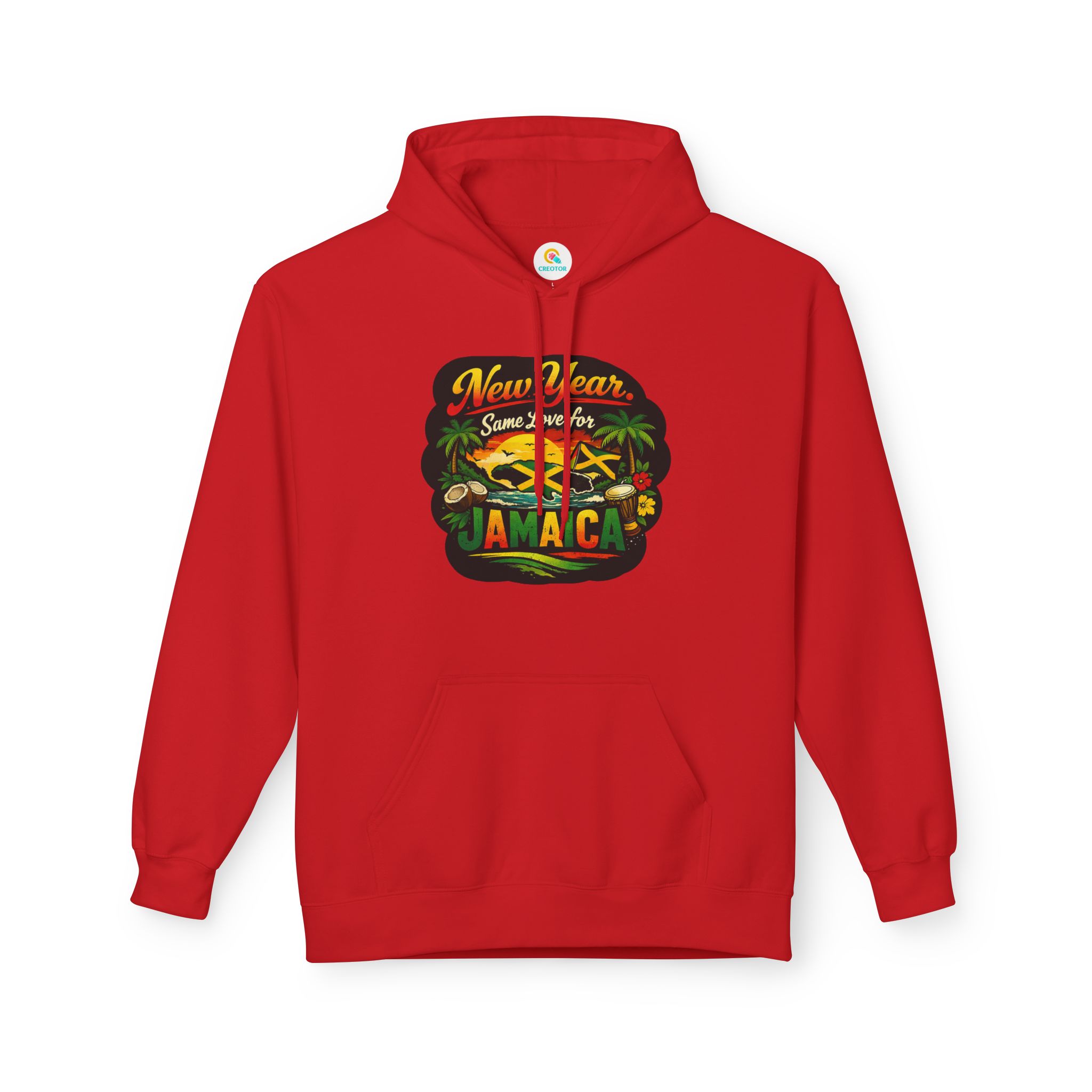 A warm, laid-back hoodie that carries a gentle island heartbeat. The tropical graphic and the line “New Year. Same Love for Jamaica.” feel like sun-warmed mornings, fresh air, and familiar streets where reggae drifts from corner shops. Lightweight but cozy, it slips into everyday wear — mornings at the café, late-night bonfires on the beach, or a quiet walk through the neighborhood remembering home. The fit hangs relaxed across the shoulders and the roomy pouch pocket keeps hands warm or holds small essentials. Thoughtfully made with sustainably sourced fabrics and ethically certified production, this hoodie blends comfort, conscience, and Caribbean spirit into one wearable memory.